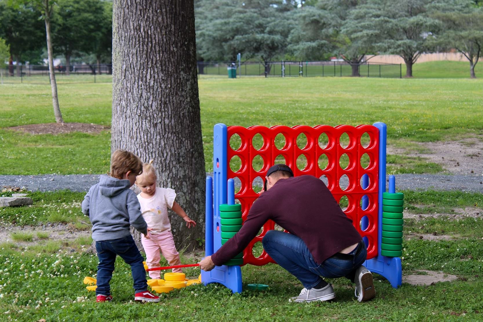 Children playing with a giant Connect Four game outside.