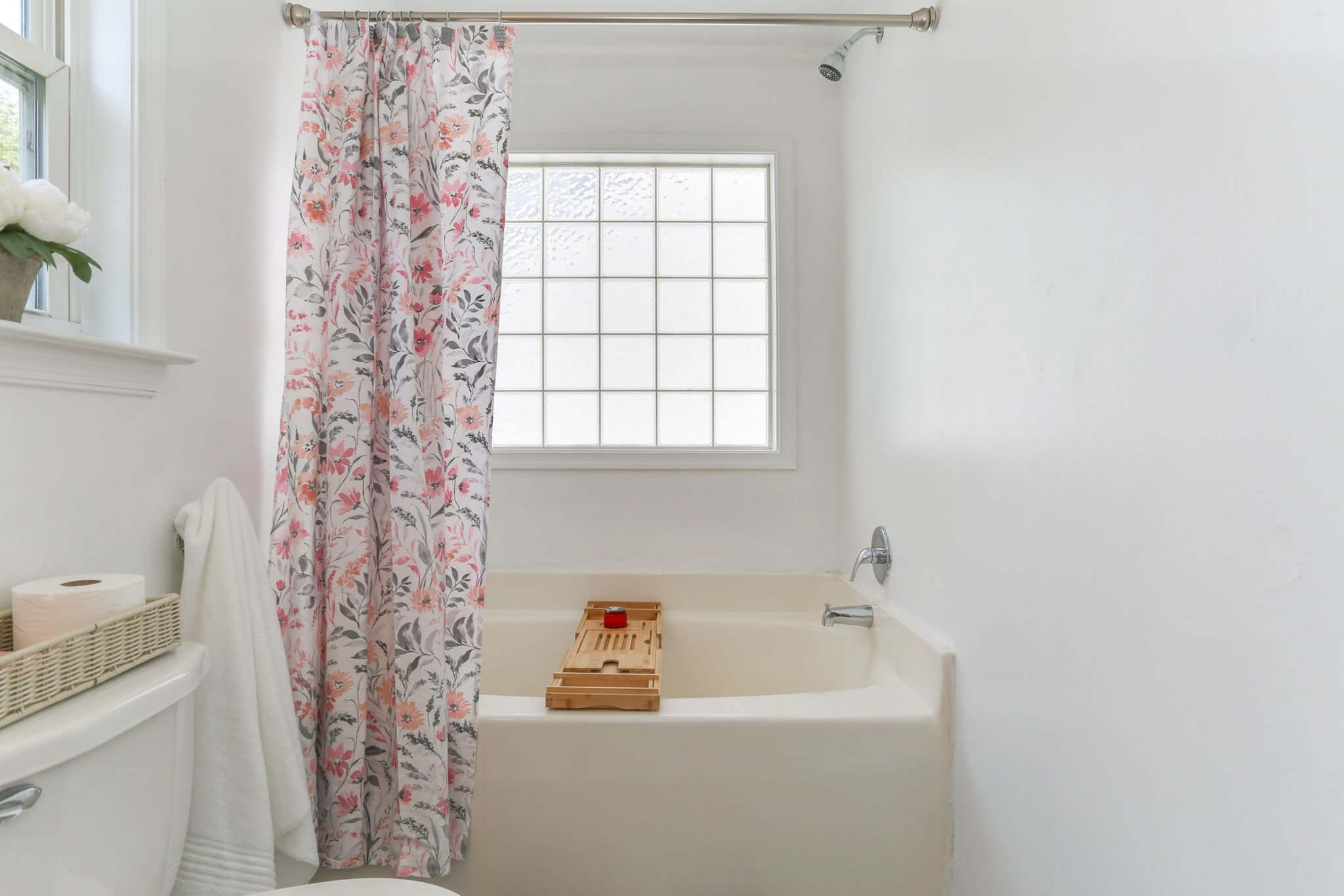 Bathroom with floral shower curtain, white bathtub with wooden caddy, glass block window, and wicker basket with toilet paper on toilet tank.