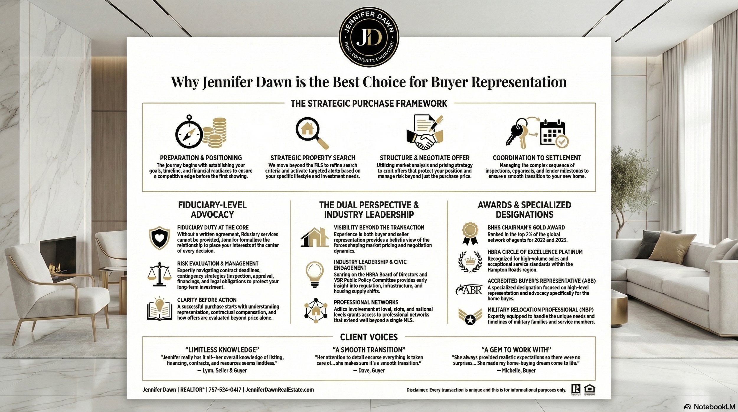 ⭐ Why Buyers Choose Jennifer Dawn for Representation: An overview of the strategic framework, fiduciary advocacy, and experience guiding your purchase.